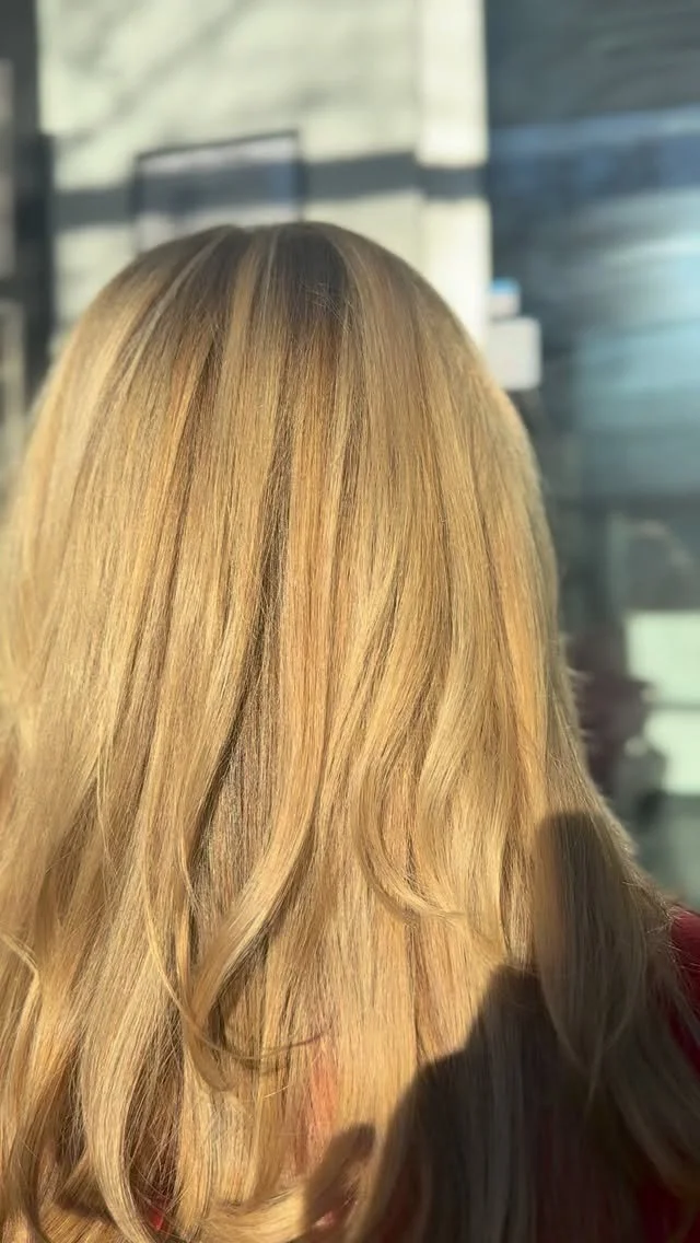 swear nothing makes me happier than keeping her blonde and bouncy. Layers for movement, brightness for that soft glow and a whole lot of love behind the chair.